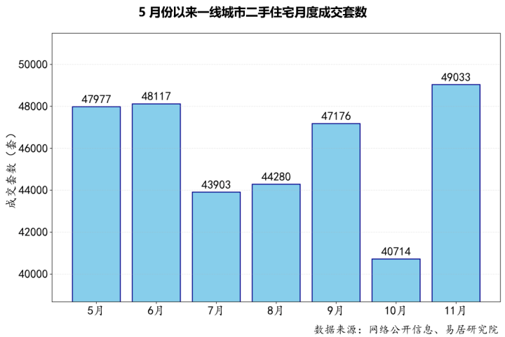 上海易居房地产研究院近日发布的报告显示,11月份一线城市二手住宅成交套数达49033套,创下自5月份以来新高。