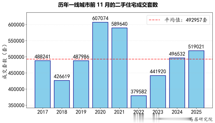 根据报告,截至11月,四个一线城市全年二手住宅累计成交519021套,不仅超越2024年同期的496532套,同比增长约5%,更是近四年来首次突破51万套大关,达到近9年的第三高水平,仅次于2020和2021年。